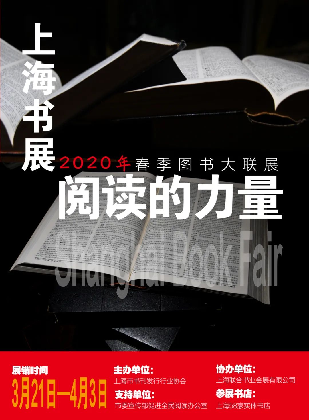 3月21日-4月3日,在上海市委宣传部促进全民阅读办公室的指导下,上海市书刊发行行业协会推出“上海书展·阅读的力量”春季图书大联展特别活动,上海书城福州路店、光的空间新华书店、艺术书坊、上海外文书店、思南书局、朵云书院旗舰店、上海香港三联书店、博库书城宜山店、上海大众书局美罗店、现代书店静安嘉里中心店、钟书阁芮欧店、上海大众书局世博源店、言几又•今日阅读 新天地店、大隐书局武康店、百新书局长宁缤谷广场店、建投书店、读者书店外滩旗舰店、博林书城等上海58家主要实体书店参展。