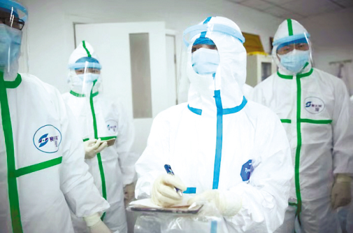 除夕当天,余瑾毅(中)在武汉市红十字会医院隔离病房跟着医生一起查房。柯皓摄 2月5日傍晚,在结束了一天的采访后,余瑾毅再也…